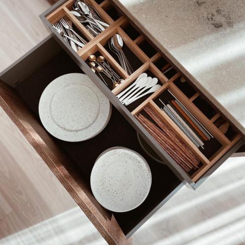 Erityisesti muotoiltu laatikkopohja harmaasta huovasta keittiölaatikkojesi pohjalle.
