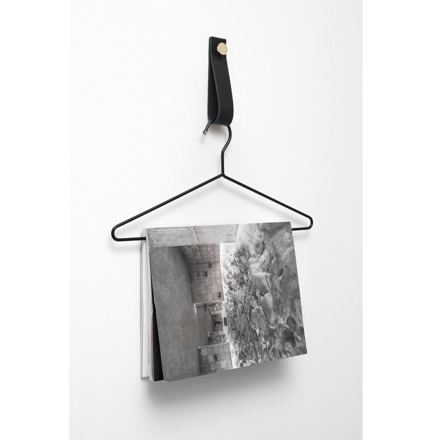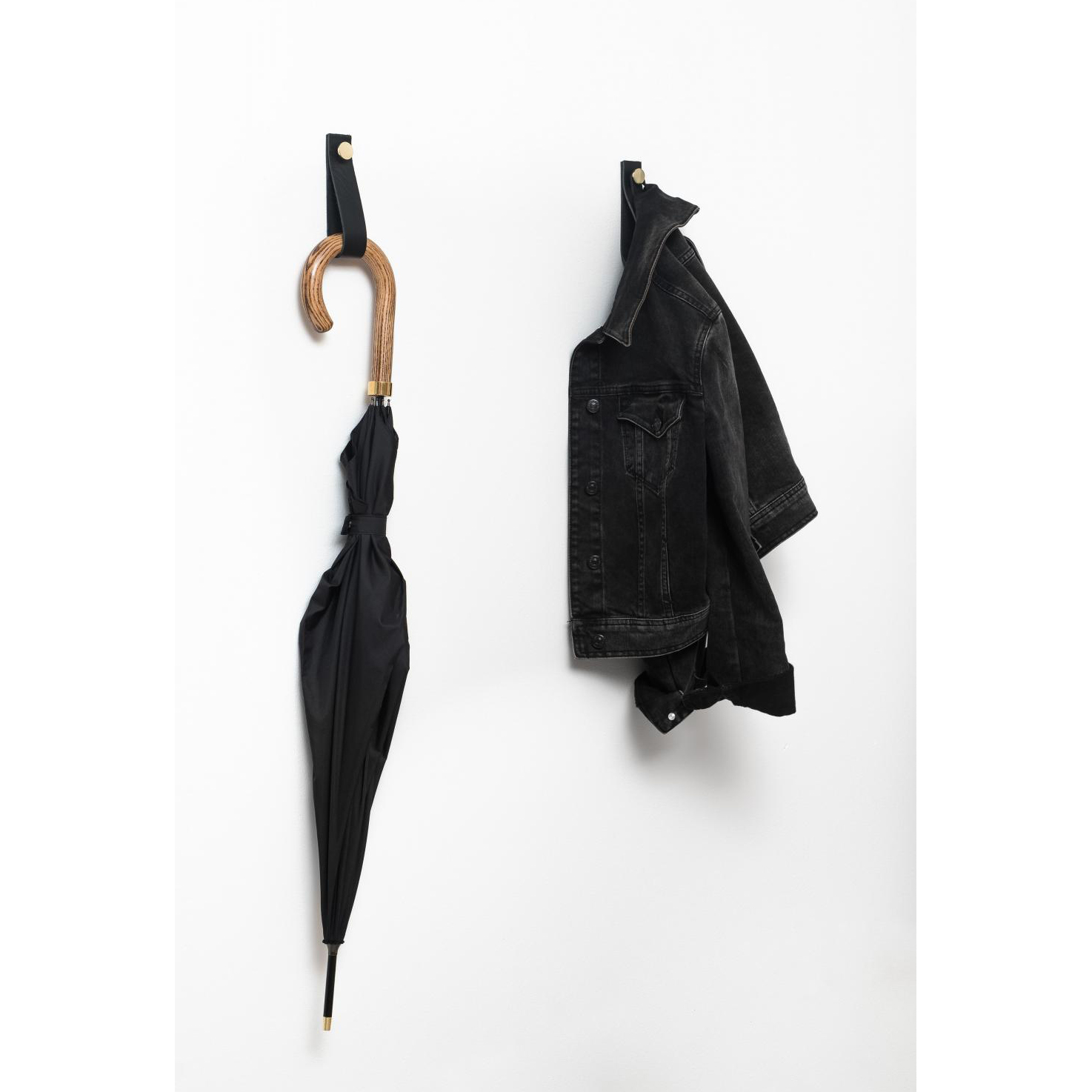 Nahka koukku tyylikkääseen säilytykseen keittiössä, kylpyhuoneessa ja käytävässä. Mustaa nahkaa ja messink yksityiskohtia.