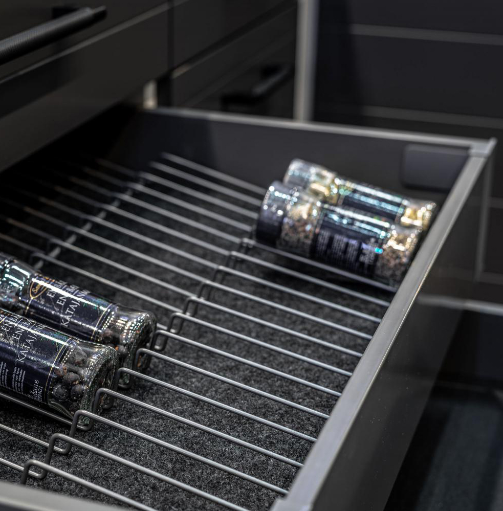Tyylikäs ja käytännöllinen metallinen mausteinsertteeri, joka luo siistin ja käytännöllisen yleiskatsauksen laatikossa olevista mausteista. Ritilä varmistaa, että mausteet pysyvät paikoillaan laatikossa, ja voit lajitella ne niin, että näet helposti, mitä sinulla on laatikossa.