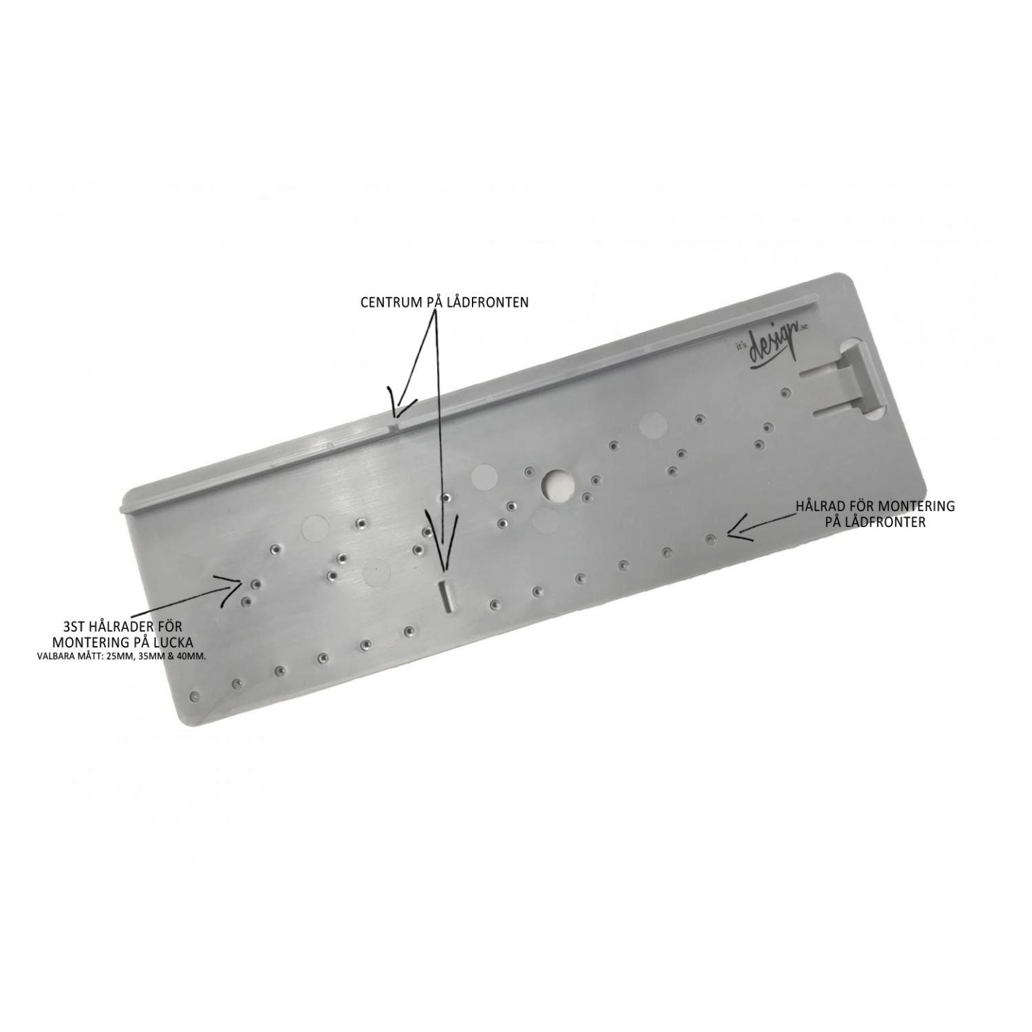 Älykäs merkintäpohja kahvojen asentamiseen ovissa ja laatikoissa. Reiät on asetettu yleisimmille cc-mitoille, cc32, 64, 96, 128, 160 ja 192. Täydellinen kotipuutarhurille, joka asentaa itse, sillä voit olla varma, että kaikki kiinnikkeet ovat oikeassa kohdassa. Mallia käytetään merkitsemään, mihin reiät ovelle tai laatikolle tulee, ja sitten reiät porataan.