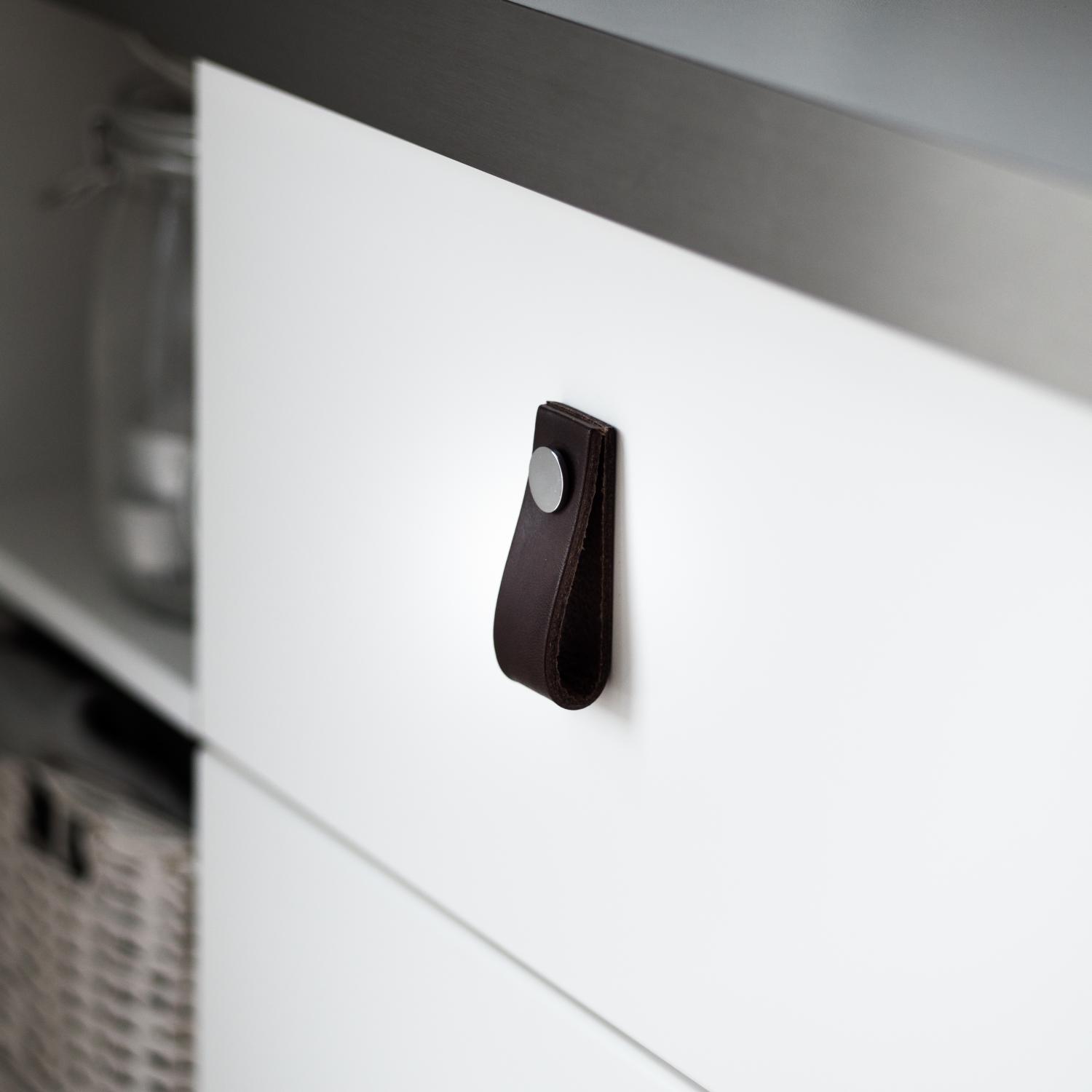 Nahkaknoppi Loop on moderni nappi, joka koostuu "nahkaliuskasta" ja pienestä metallinapista kiinnityksellä. Nappi on kuin taitettu nauha nahasta tyylikkäällä ja käytännöllisellä otteella keittiön laatikoissa ja kaapeissa tai kommodeissa. Nahkaliuska on erittäin suosittu ja sopii niin moderniin sisustustyyliin kuin raa'an ja teollisen sisustuksen tyyliin!