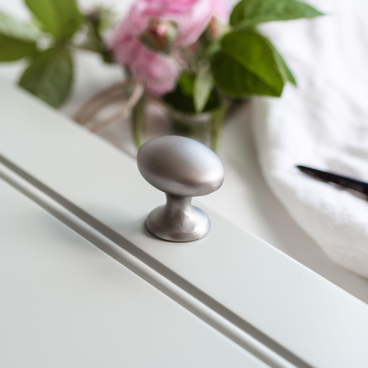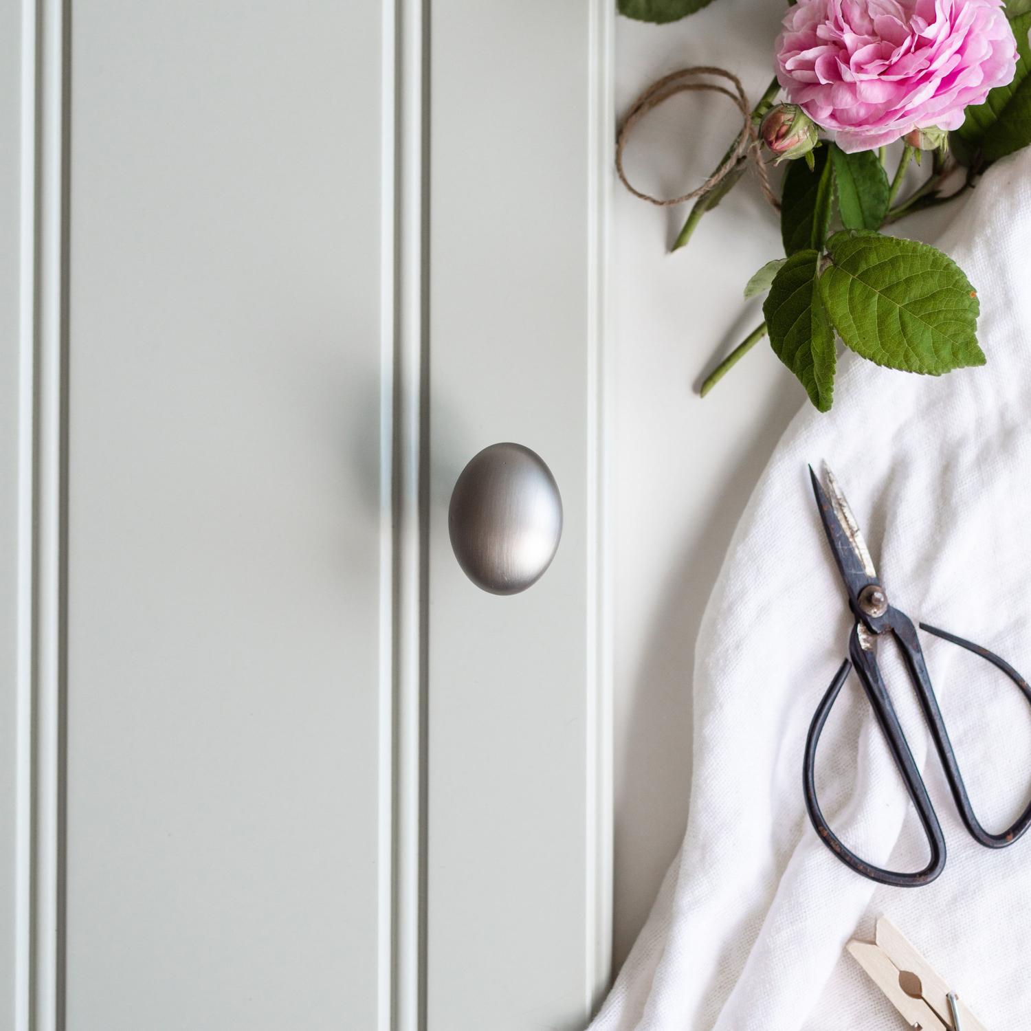 Klassinen ovaali keittiön nuppi nikkelistä moderniin maalaistyylistä keittiöön.