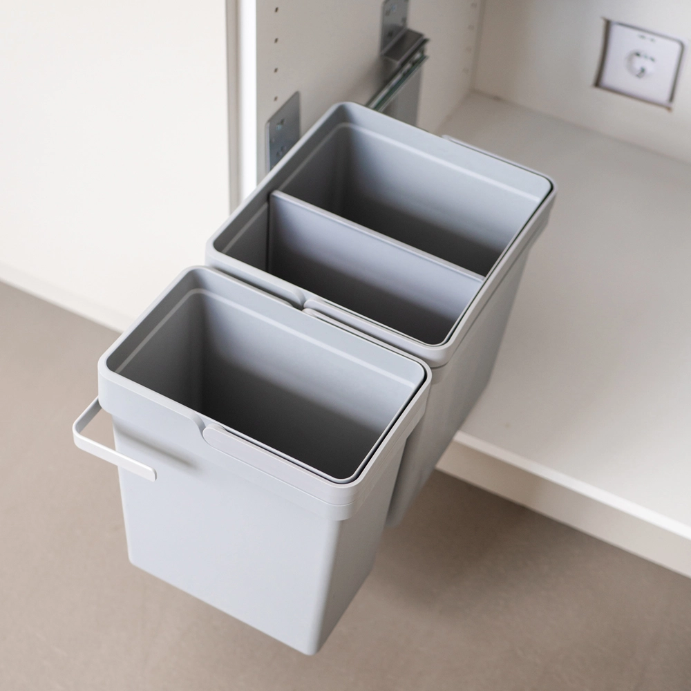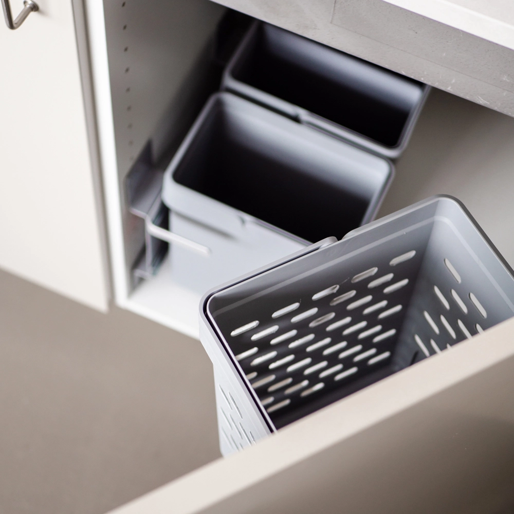 Kolmeosainen jätteiden lajittelujärjestelmä keittiökaapin oveen asennettavaksi. Täydellinen sarja, jossa on 3 ämpäriä, joista yksi on varustettu ilmanvaihtoaukoilla kompostia varten. Kaksi ämpäriä asennetaan mukana tulevaan kehykseen kaapin sivulle, ja kolmas voidaan kiinnittää vastakkaiselle puolelle tai kaapin oveen itseliimautuvalla kiinnikkeellä. Ämpärit on helppo nostaa pois tarvittaessa ja ne voidaan täydentää kannella.
