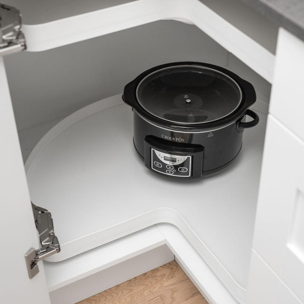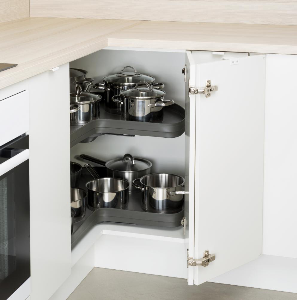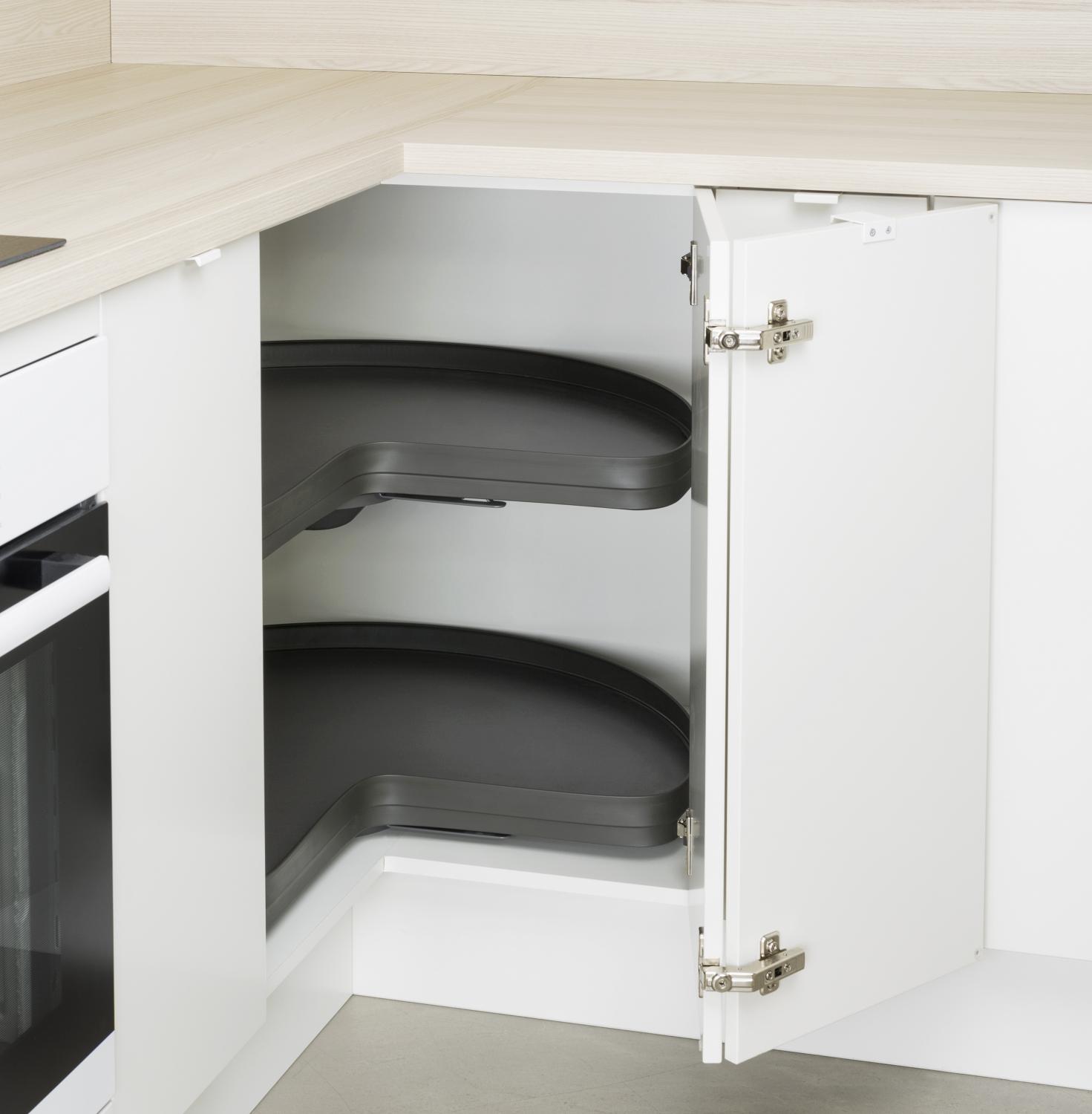 - Täysipohja ja ilman keskikeppiä maksimoivat tämän 3/4-karusellin säilytysmahdollisuudet nurkkakaapissa.