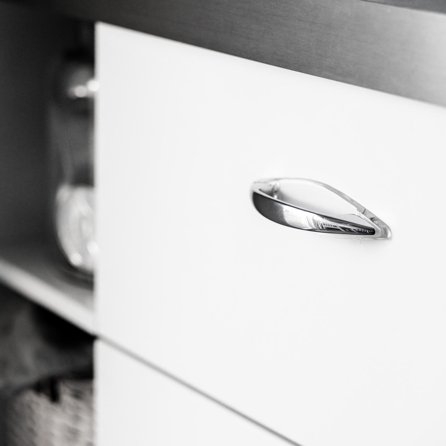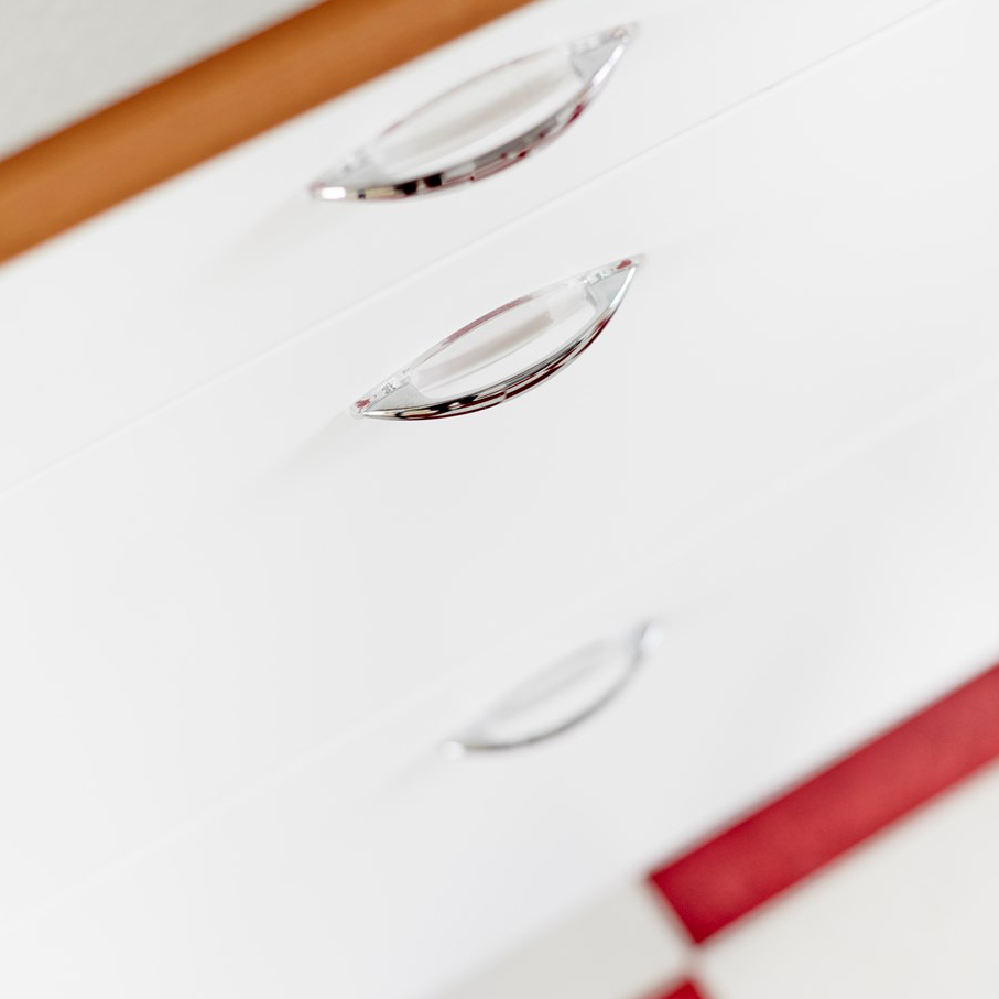 Kitchen handle 555 on upea alkuperäinen 1950-luvulta, mukana muovinen levy. Jos sinulla on vanhempi keittiö 1900-luvun puolivälistä, tämä kromi- ja muovivetimet on itsestäänselvä valinta!
