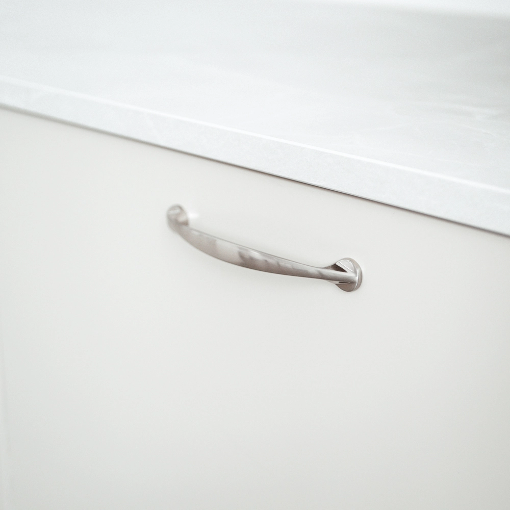 Keittiön vetimet mattapintaisessa nikkelissä, jossa yksityiskohtia jaloissa ja kapea vetimet.